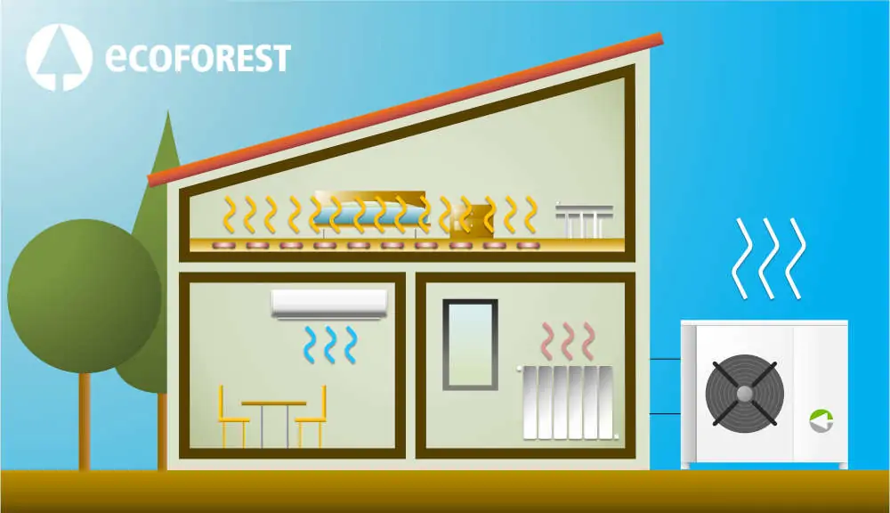 Typiquement, les pompes à chaleur aérothermiques sont constituées de deux éléments : un module extérieur où se trouve le circuit frigorifique et un module intérieur où se trouvent l’unité de contrôle et le reste des éléments nécessaires dans l’installation, présentant des différentes configurations.
