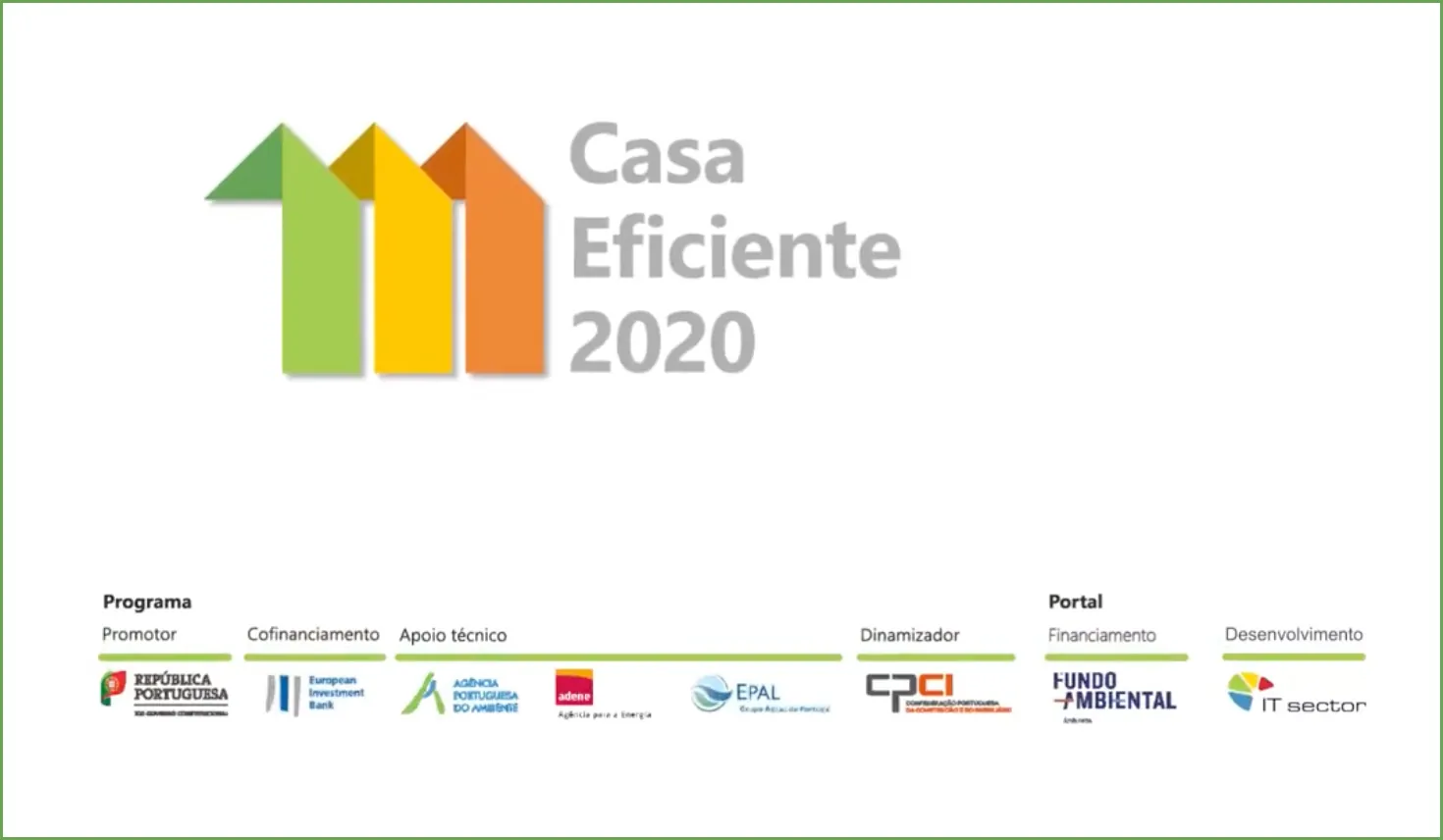 O programa “Casa Eficiente 2020” visa conceder empréstimo em condições favoráveis a operações que promovam a melhoria do desempenho ambiental dos edifícios de habitação particular, com especial ênfase na eficiência energética e hídrica, bem como na gestão dos resíduos urbanos. As intervenções poderão incidir no envelope do edifício e nos seus sistemas.